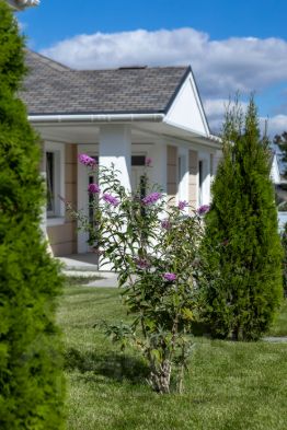 — Забор: высота - 2 м из французского камня. Боковые и задняя границы, спереди деревянный забор примыкает к боковым стенам дома.