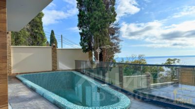 Участок площадью 11 соток полностью благоустроен, имеет продуманный рельеф, выполненный ландшафтный дизайн, несколько зон отдыха, просторные террасы с видами на море и Ялту, два бассейна, а также парковку на 4 автомобиля.