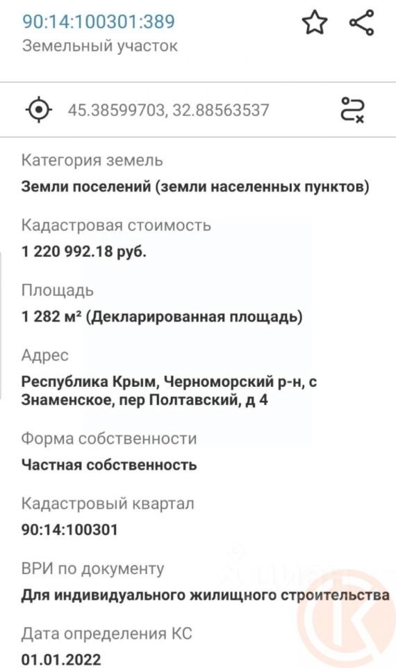 Участок расположен по адресу: Республика Крым, с. Знаменское, пер. Полтавский, что обеспечит вам комфортное и спокойное проживание вдали от городского шума. На участке уже имеются все необходимые коммуникации: централизованное водоснабжение, электричество и договор на подключение к электрическим сетям. Это избавит вас от лишних забот и позволит быстрее приступить к реализации ваших строительных планов.