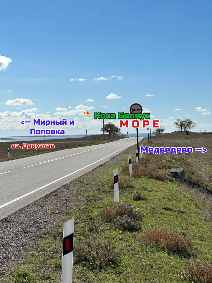 Самая видовая площадка у участка на возвышении!!! Рядом озеро Донузлав, коса Беляус с чистым белым песком и изумрудным чистым морем. Рядом пос. Мирный, Поповка -известна, как место проведения фестиваля КАЗАНТИП!