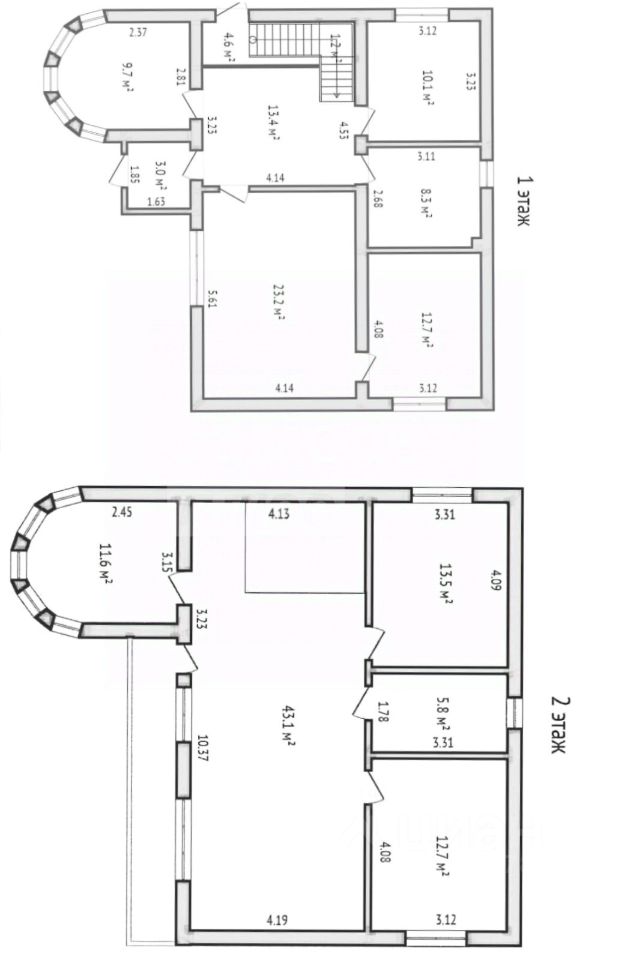 Первый этаж: кухня 9,7 кв. м, гостиная 23,2 кв. м, 2 спальни (10,1 и 12,7 кв. м), санузел 8,3 кв.м, прихожая 18,7 кв.м.