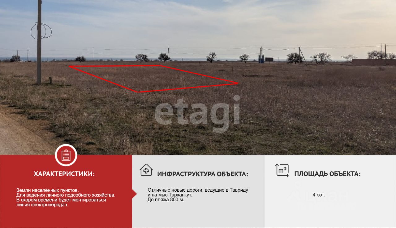 Участок расположен рядом с косой Беляус, где находятся самые красивые, широкие пляжи полуострова и чистейшее море, благодаря чему это место называют Крымскими Мальдивами. Красивые, экологически чистые места, с огромным туристическим и инвестиционным потенциалом. Местность активно застраивается. Также, в скором времени будет монтироваться линия электропередач. Отличные новые дороги, ведущие в Тавриду и на мыс Тарханкут. До пляжа 800 метров.