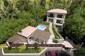 К участку с коттеджем прилагаются проекты дома и участка с бассейном.