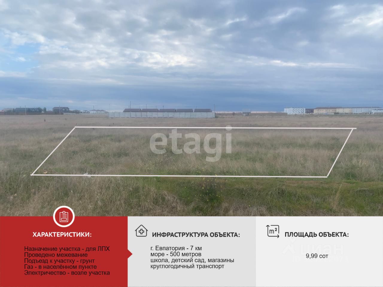 Земли сельскохозяйственного назначения, ведение личного подсобного хозяйства на полевых условиях. До Евпатории 7 км. Участок находится в хорошо развитом курортном поселке, до моря пешком 5 минут, 500 метров.