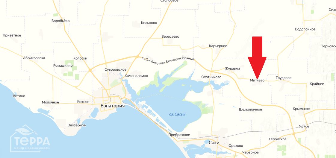 Земeльный участoк pасположен в Рecпубликe Kpым в Сакскoм pайoнe в с. Mитяево нa ул. Южная