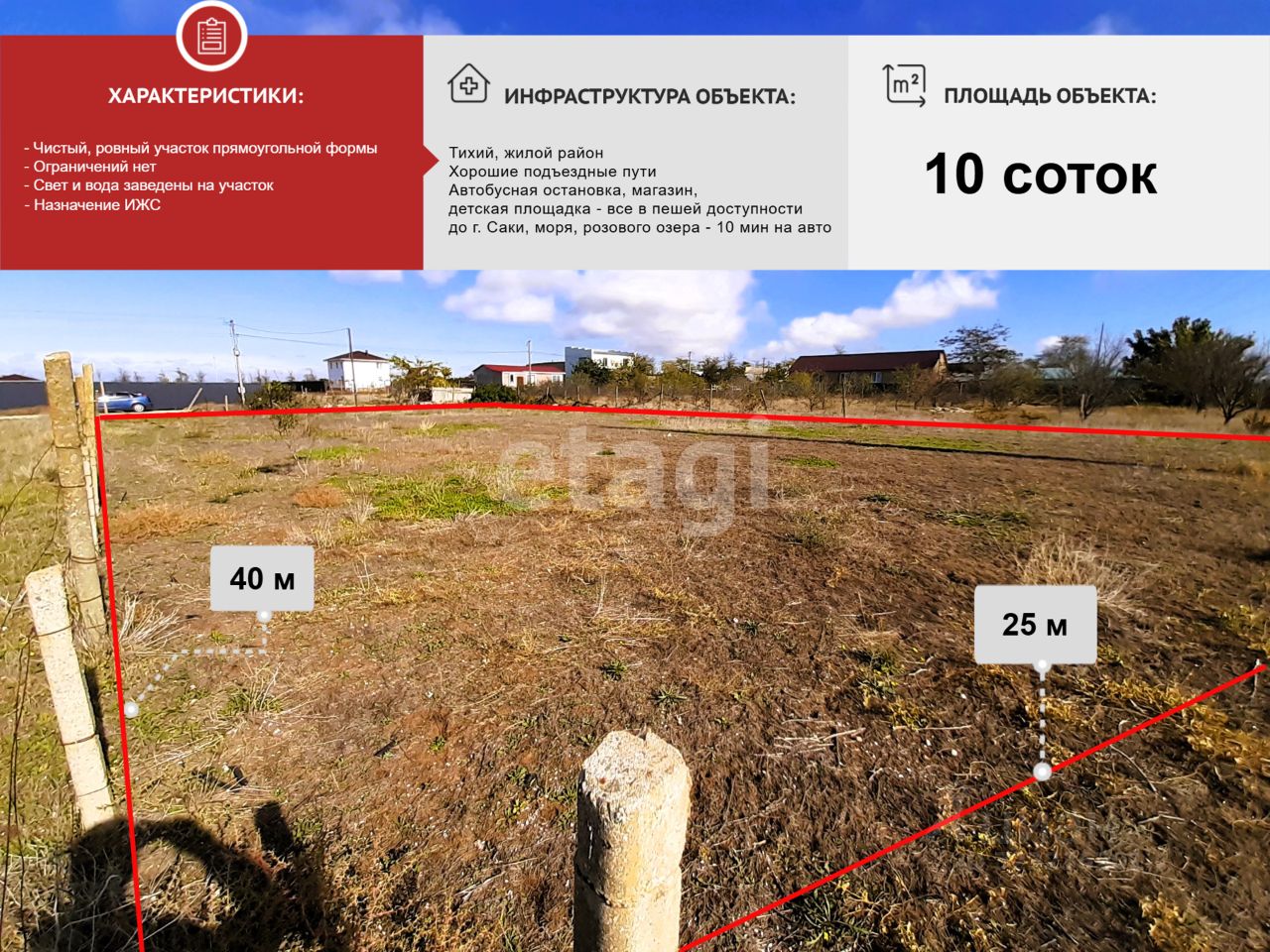 Участок оптимально расположен между городской инфраструктурой и природными достопримечательностями, что делает его привлекательным как для частного использования, так и для капиталовложений с учетом перспектив активного развития Сакского района и роста туристического потока в Крым.