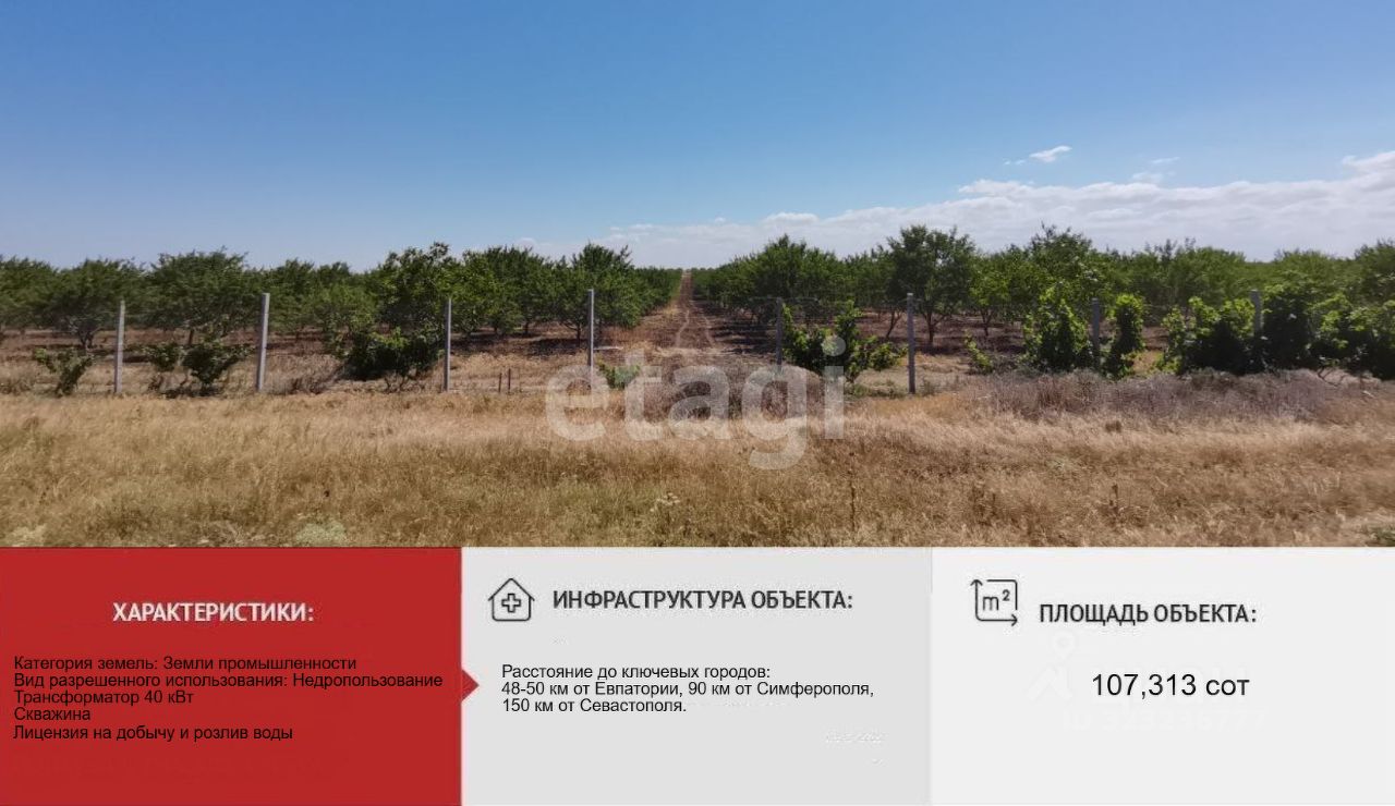 Артезианская скважина в Северо-Сивашском бассейне (глубина 63 м, дебит 98 м/сутки). Емкость 5 тонн, заполняется за 45 минут. На участке функционирует производство по розливу газированной и негазированной воды в емкостях от 0,5 л до 6 л (работает с 2019 года). Оборудование полуавтоматическое, надежное, готово к дальнейшей эксплуатации. Общая площадь строений: 320-340 м². Подтвержденные геологические запасы позволяют организовать карьер с высокой рентабельностью (оценочная выручка свыше 2,8 млрд руб. по консервативным ценам).