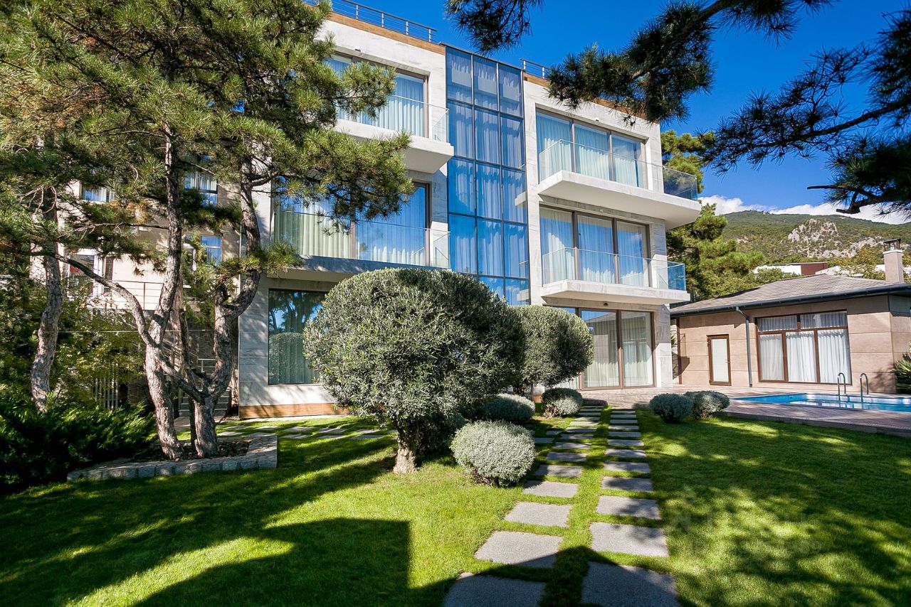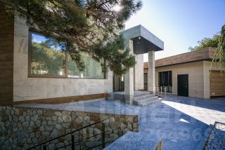 Стильная и современная вилла в окружении хвойных деревьев и можжевеловой рощи.