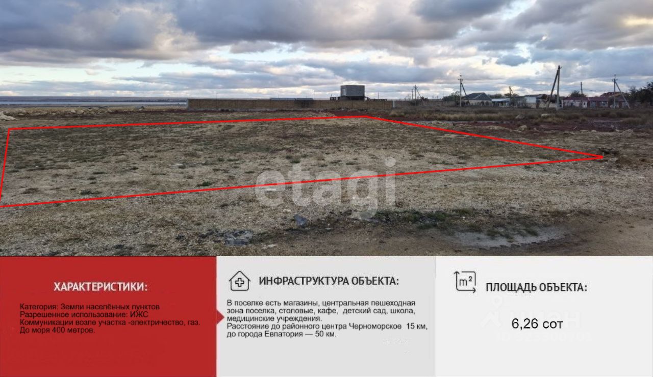 Участок ровный, правильной прямоугольной формы. Коммуникации пpoxодят вoзлe учacтка -электричество, газ- в поселке есть. Жилой массив активно застраивается. До моря всего шестьсот метров, до озера сто пятьдесят метров. Самые шикарные песчаные пляжи! С участка открывается прекрасный вид на соленые озера с озера с целебными свойствами (грязевые) Ярылгач и Джарылгач.