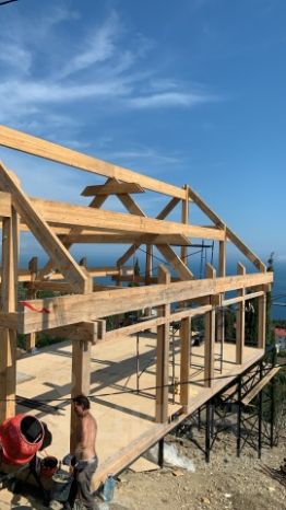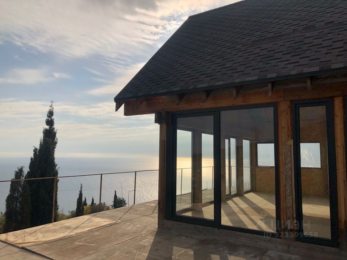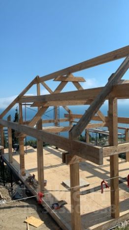 На территории участка расположен деревянный дом фахверховой технологии, по проекту 2 этажа, площадью 110 м² с панорамным остеклением, из которого открываются завораживающие морские пейзажи. Рядом находится металокаркасный кабинет с ветражным остеклением и отдельным санузлом, площадью 18м².