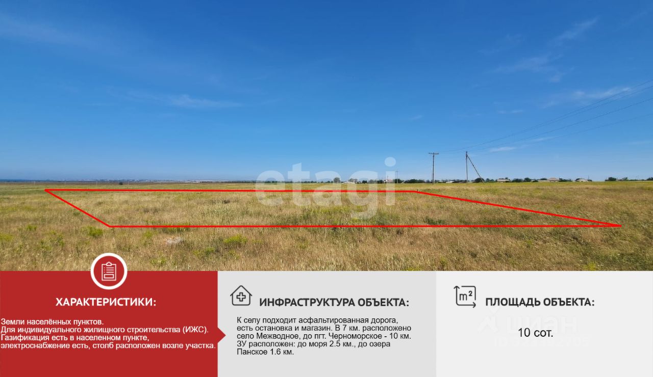 Продаётся земельный участок площадью 10 соток в селе Снежное, Межводненского сельского поселения, Черноморского района. Участок относится к землям населённых пунктов с разрешенным использованием под ИЖС.