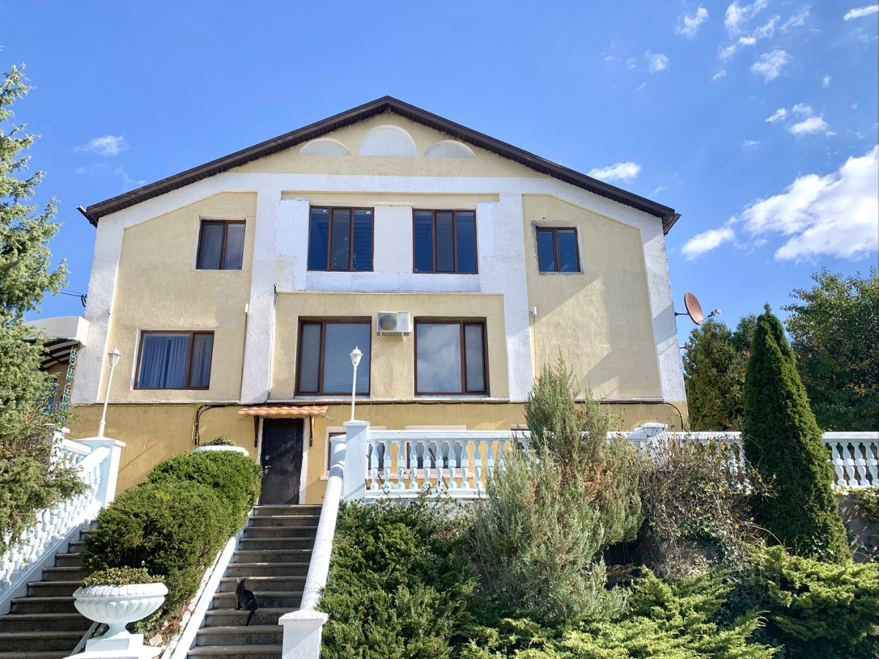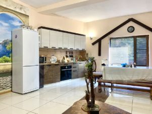 Основное здание жилого дома общей площадью 290.9 м², 3-этажное. Здание высочайшего качества строительства: монолитно-каркасная конструкция, наружные стены блочные (ракушечник), облицованные кирпичом. В доме предусмотрено 5 спальных комнат, просторная кухня-гостиная, холл, барная зона, вспомогательные помещения, санузлы. Вход на 3-ий этаж дома - изолированный. В помещениях выполнен ремонт, состояние жилое.Здание гостевого дома 2006 года постройки, 2-этажное, общей площадью 104,1 м². Монолитно-каркасная конструкция, блочные (ракушечник) стены и перегородки. В здании предусмотрено 2 спальных помещения, кухня, санузел, газовая котельная, кладовые помещения. В помещениях выполнен ремонт, состояние жилое.Нежилое здание 2016 года постройки, общей площадью 211,6 м², 2-этажное. Возведены основные несущие конструкции и стены здания (монолитный каркас и перекрытия,стены - ракушечник), здание зарегистрировано.Площадка (корт) для игр в теннис, баскетбол, волейбол;Кирпичное здание беседки с барбекю;Бассейн;Беседка, зоны отдыха и занятия спортом;Парковочная площадка на 6 машиномест.