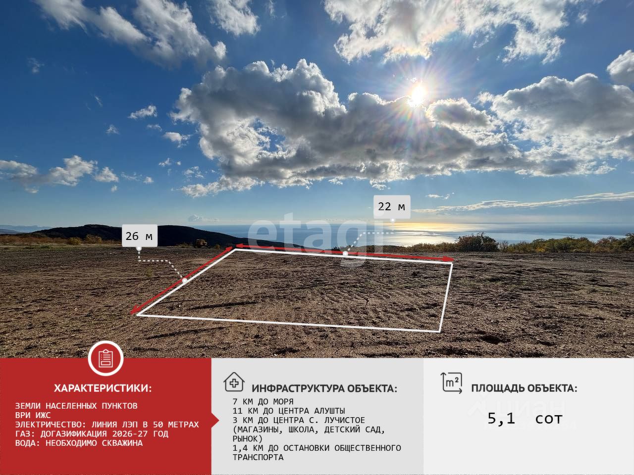 Земельный участок площадью 5,13 сотки расположен в поселке Лучистое вблизи Алушты и предлагает уникальную панораму на 360 градусов, объединяющую морские просторы и горные хребты. Участок находится в экологически чистой местности на южном склоне горы Демерджи на высоте 500 метров над уровнем моря, что обеспечивает лечебный горный воздух и круглогодичный комфортный климат.