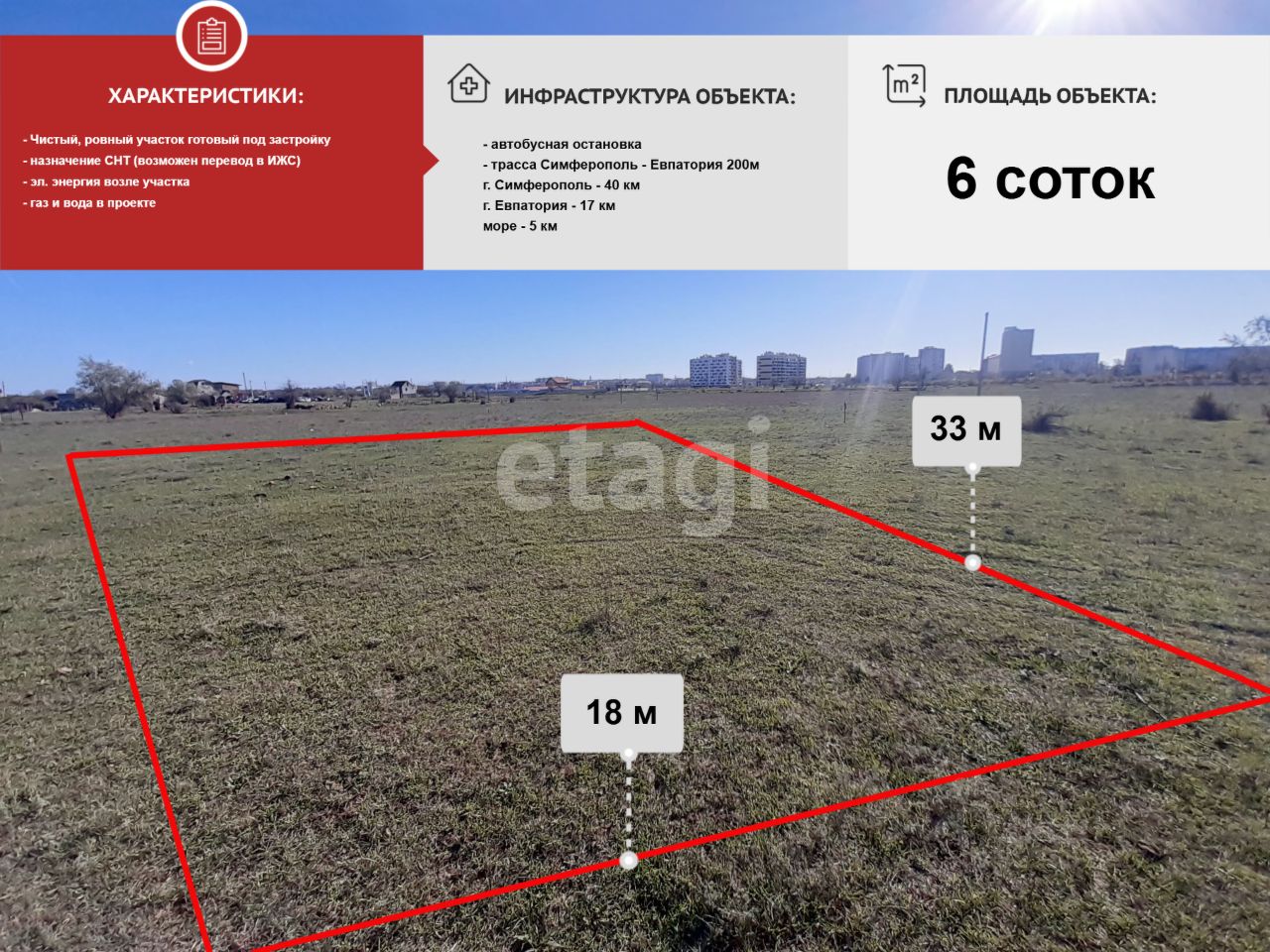Участок площадью 6 соток расположен в СНТ в 250 метрах от трассы Саки-Евпатория, что гарантирует отличную транспортную доступность и легкий выезд в любом направлении.