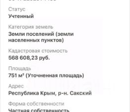 Продается земельный участок ИЖС площадью 7.51 соток по адресу Республика Крым, р-н Сакский, с. Уютное. Участок ровный прямоугольной формы. По границе участка проходит центральный водопровод, ГАЗ. До центра города 1 км. до городского пляжа 2 км. В селе хорошо развита инфраструктура, имеются по близости: Сто, шиномонтаж, строительные магазины, продуктовые магазины, школа, детский сад. Кадастровый номер участка:90:11:220201:1466