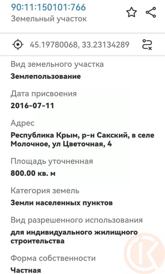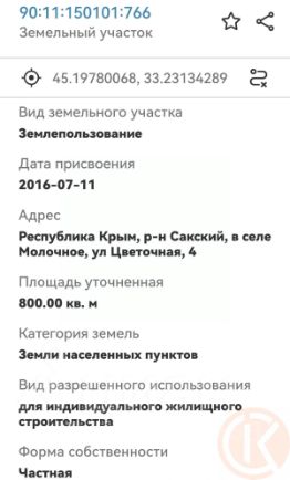 Продается участок 8 соток ИЖС, ровный, прямоугольной формы, коммуникации рядом, 11 км до Евпатории. Выполнено межевание, кадастровый паспорт, градостроительный план участка.