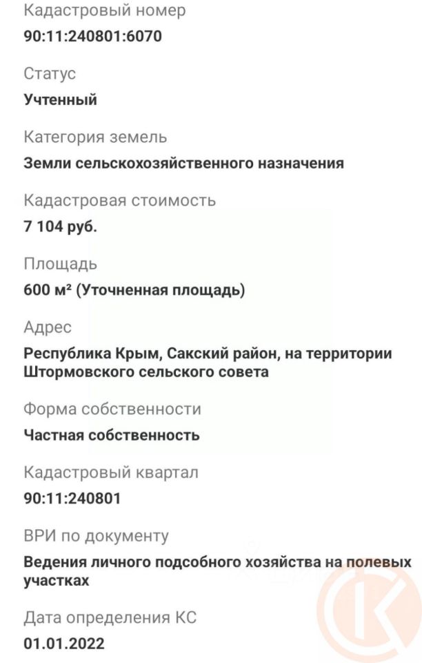 Без комиссии для покупателя продается участок недалеко от моря в курортном поселке Штормовое, в самом сердце прекрасного Сакского района Республики Крым. Площадью 6 соток, данный участок идеально подойдет для постройки уютного коттеджа или загородного дома. С юридическим статусом личного подсобного хозяйства и приватизированным земельным участком, вы будете иметь полное право владеть этим участком и использовать его для своих нужд. 90:11:240801:6070