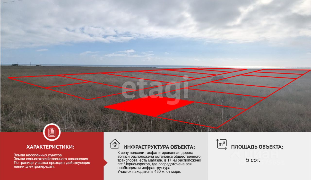 Продаётся земельный участок площадью 5 соток в селе Марьино, Окунёвского сельского поселения, Черноморского района. Участок относится к землям населённых пунктов, к категории сельскохозяйственного назначения.