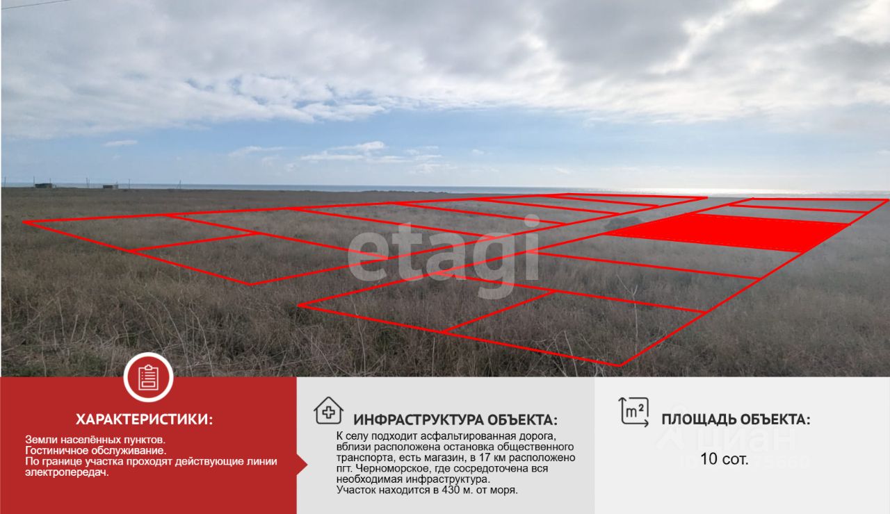 Продаётся земельный участок площадью 10 соток в селе Марьино, Окунёвского сельского поселения, Черноморского района . Участок относится к землям населённых пунктов, к категории - Гостиничное обслуживание.