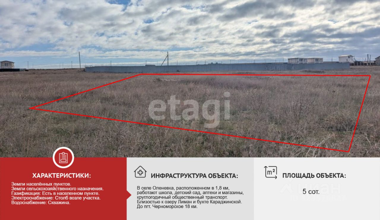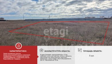 Продам земельный участок, площадью 5 соток в Оленевском сельском поселении вблизи Тарханкутского Заповедника. Участок относится к землям населенных пунктов с разрешенным сельскохозяйственным использованием, что предоставляет широкие возможности для строительства и ведения хозяйства.