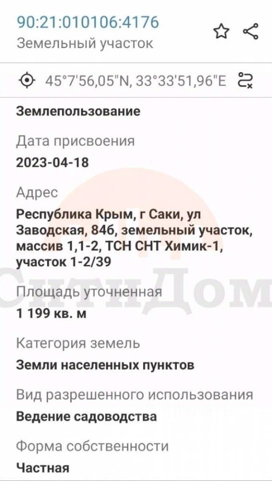 Продается земельный участок в Саках СНТ Химик-1, массив 1, возле ул. Морозова!