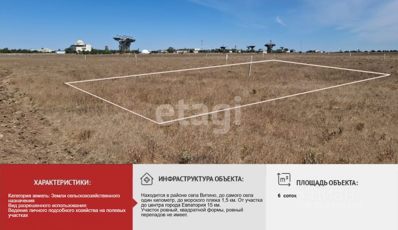 Участок находится на расстоянии 700 метров от села Витино. До города Евпатория 15 км. До берега моря 1500 метров.