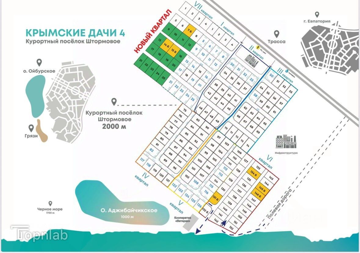 Продам земельный участок на побережье Крыма, Сакский район. Асфальтированный подъезд. Ровный ландшафт. По границе свет и вода. В новом Генплане высокая вероятность вхождения всего массива в зону общественно-деловой застройки населенного пункта Штормовое. Пешая доступность до лечебных озёр и лучшего черноморского побережья во всей России. Участок номер 14 на карте.
