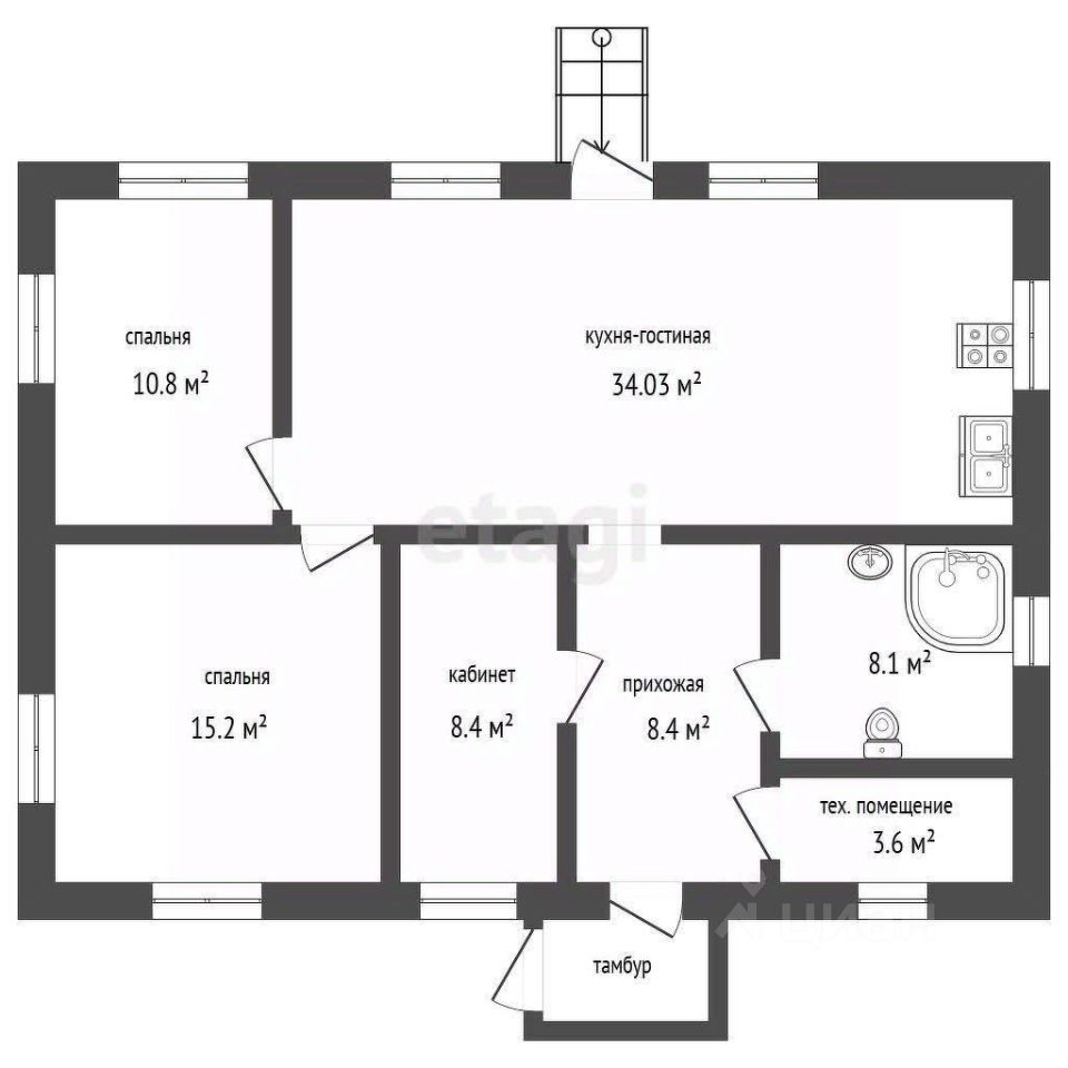 Удобная планировка включает два входа: основной через тамбур и второй — из кухни-гостиной на террасу. В доме предусмотрены теплые полы в кухне-гостиной, прихожей и санузле, а в спальнях установлены радиаторы отопления. Все коммуникации готовы к эксплуатации: электрощиток с автоматами и УЗО, разводка электрики по всему дому, смонтированы выключатели, розетки и осветительные приборы.
