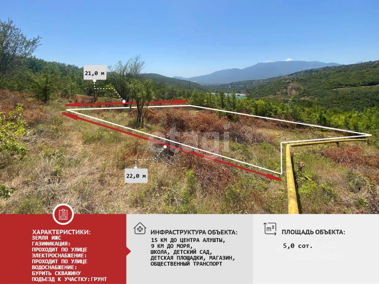 Участок имеют небольшой уклон, что открывает возможности для создания многоуровневого ландшафтного дизайна и нестандартных архитектурных решений. Коммуникации организованы следующим образом: водоснабжение обеспечивается за счет индивидуальных скважин, электричество подключается по заявке в "Крымэнерго", канализация возможна как септик, так и перетечная система. Газопровод по границе участка. Газовую трубу поднимать будут общими силами все собственники 7 участков. Схему расположения порталов я вышлю по желанию клиента.