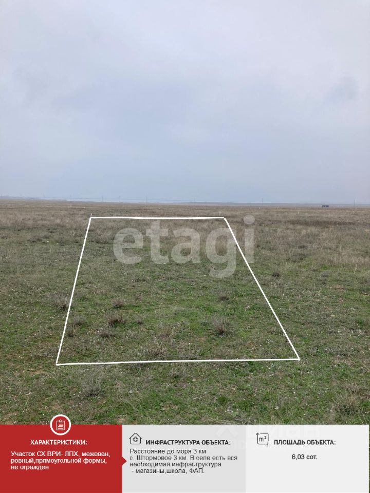 Участки зашли в границы нового генплана село Штормовое (на рассмотрении, после принятия генплана в дальнейшем, возможно капитальное строение, подвод коммуникаций, прописка.) цена участка вырастет в несколько раз. Электричество: столб возле участка. Газ есть в населенном пункте. Водоснабжение бьют не глубокую скважину.