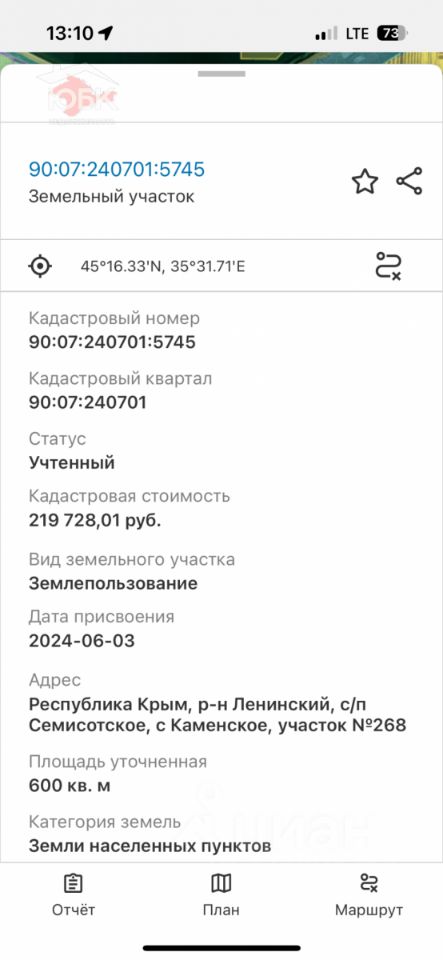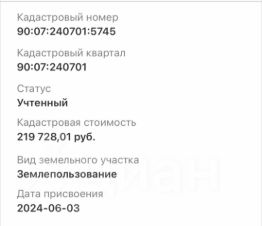 Заинтересованы? Я с удовольствием проведу онлайн-показ объекта, чтобы вы могли оценить все преимущества этого замечательного участка. Кадастровый номер 90:07:240701:5745 подтверждает легальность сделки. Не пропустите возможность стать владельцем этого прекрасного участка и начать новую главу в своей жизни на побережье!