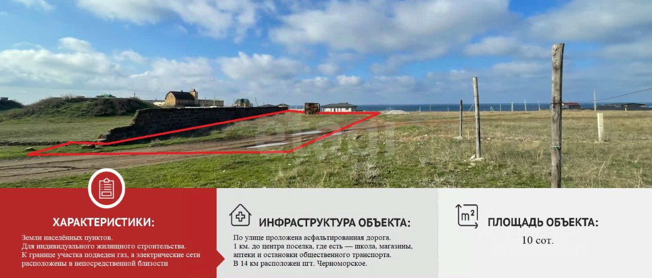 Продаётся земельный участок площадью 10 соток в селе Межводном Черноморского района, участок предлагает отличную возможность для индивидуального жилищного строительства.