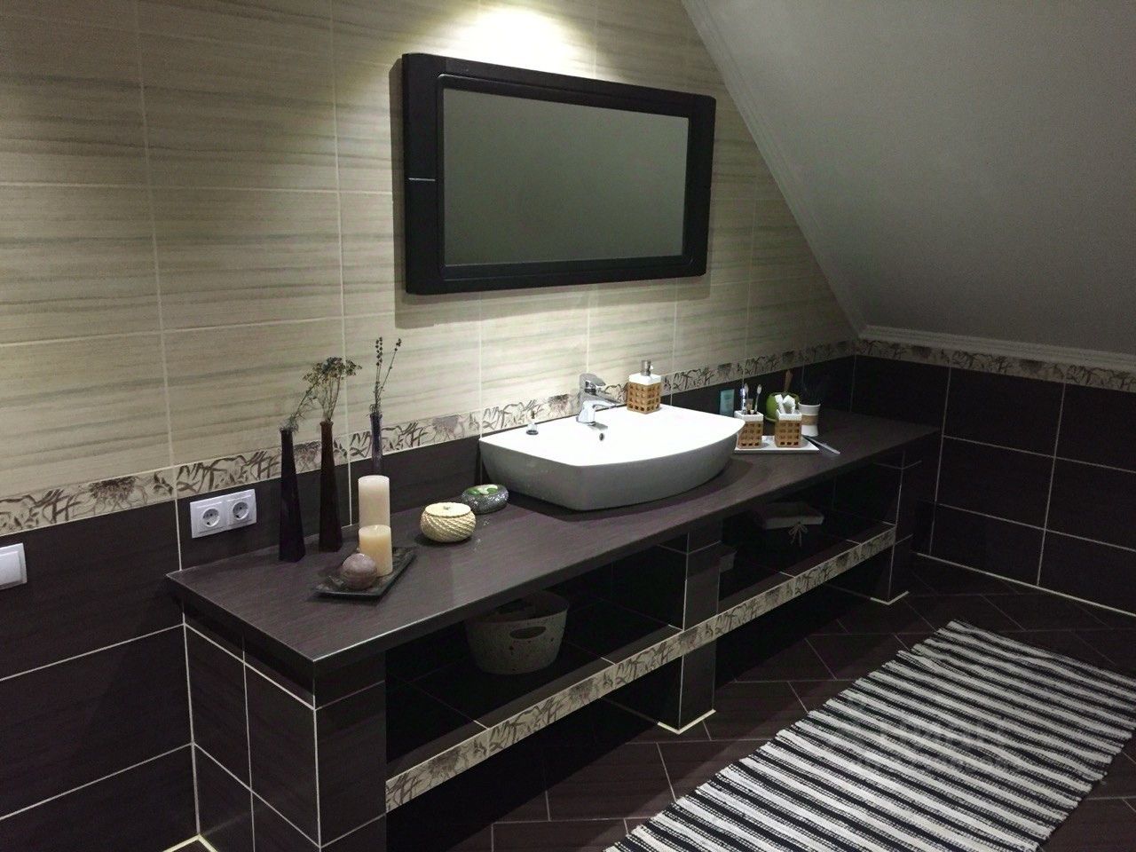 3 комната - ванная 16.5 м.кв: ванная с мансардным окном, туалет, большой стол с раковиной и зеркалом, шкаф для хранения белья, полотенец, косметических средств