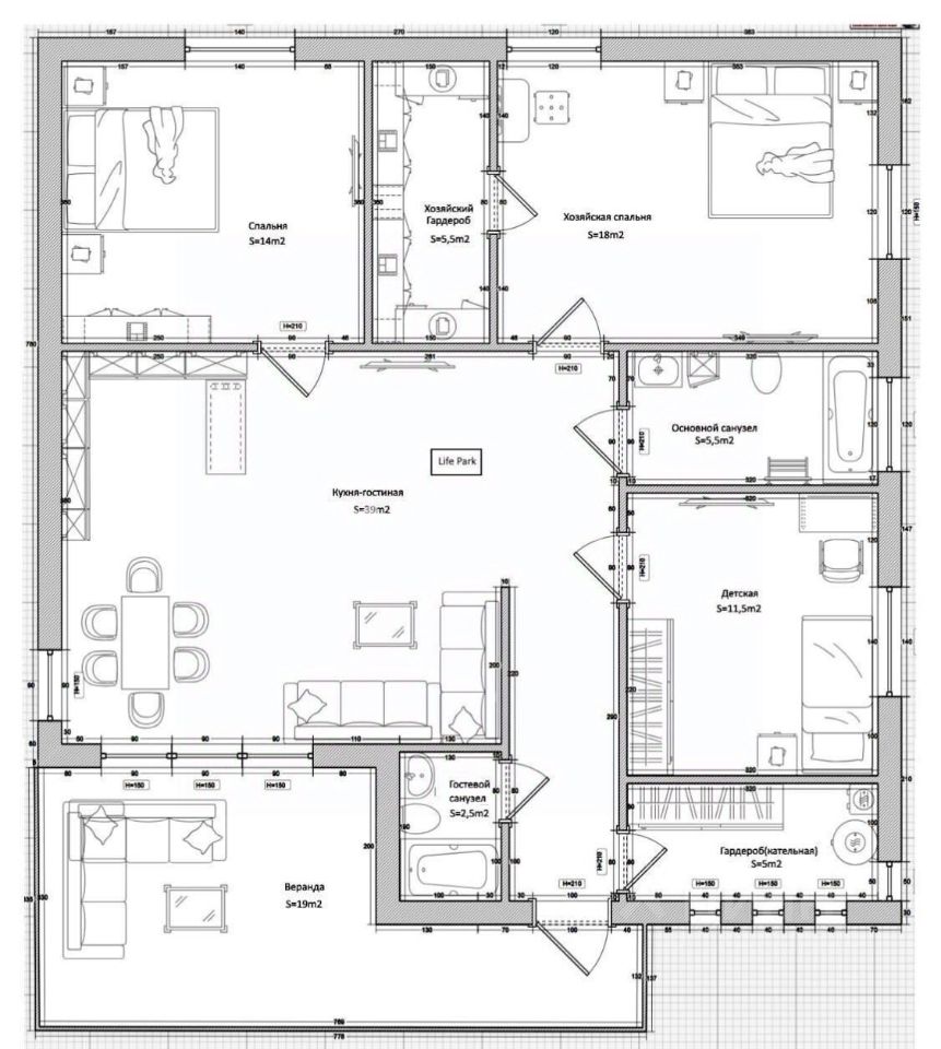 • Планировка: 3 спальни, 2 санузла, котельная, 2 гардеробные, кухня-гостиная.