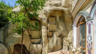 У главного входа в дом расположен фонтан окруженный мраморными скамейками, привезенными из Рима. У детского домика возведен искусственный водопад.
