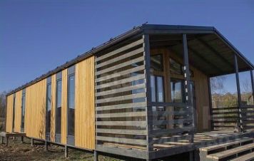Дом с теплым контуром, черновым полом из OSB, полностью отделанным фасадом, остеклением, входной дверью и кровлей.
