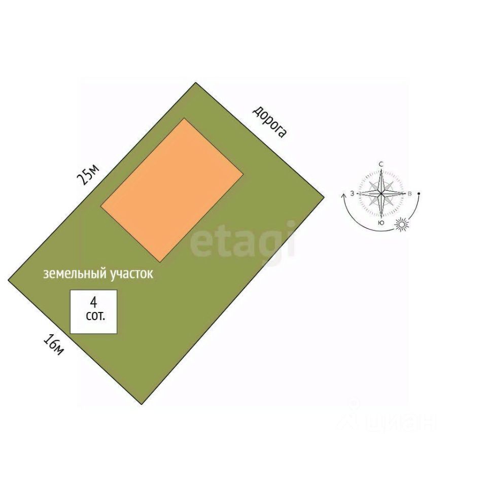Площадь: 4 сотки — достаточно места для сада, огорода, зоны барбекю и детской площадки.