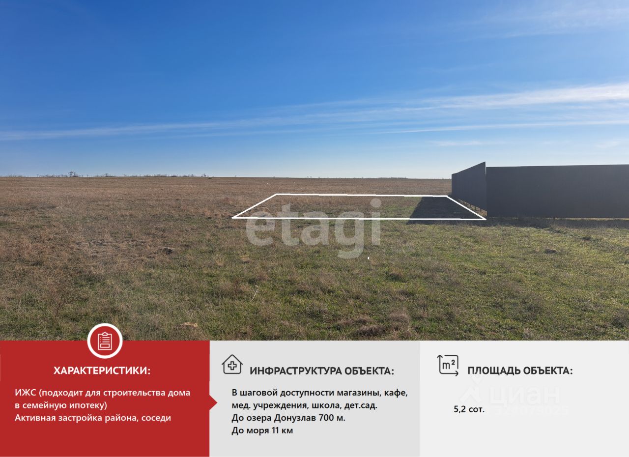 Участок предназначен для индивидуального жилищного строительства с возможностью постоянной прописки или сезонного отдыха. Ровная территория правильной формы с проведённым межеванием полностью готова к строительству — ничего не нужно выравнивать. Участок расположен в новом массиве всего из 200 наделов в пгт Новоозерное с евпаторийской пропиской, что даёт право на посещение детских садов и школ г. Евпатория.