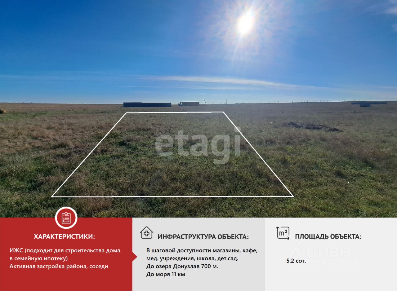Участок предназначен для индивидуального жилищного строительства с возможностью постоянной прописки или сезонного отдыха. Ровная территория правильной формы с проведённым межеванием полностью готова к строительству — ничего не нужно выравнивать. Участок расположен в новом массиве всего из 200 наделов в пгт Новоозерное с евпаторийской пропиской, что даёт право на посещение детских садов и школ г. Евпатория.