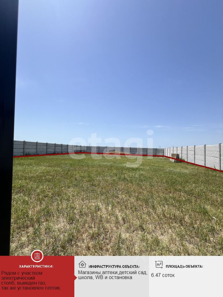 Участок pовной и пpaвильной формы. По границам участка установлен бетонный забор и новая металлическая калитка. Рядом с участком электрический столб, выведен газ, так же установлен септик.