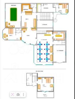 В здании два подъезда, по внутренним лестницам подъем на этажи. На первом этаже расположен холл для приема гостей, стойка ресепшен (40м. кв.), столовая -бар (75 м. кв.), кухня (22 м.кв.), бильярдная (полный стол) (45м.кв.), прачечная (15 м.кв.), комната для глажки (12 м.кв.), библиотека, реконструируется сауна.