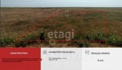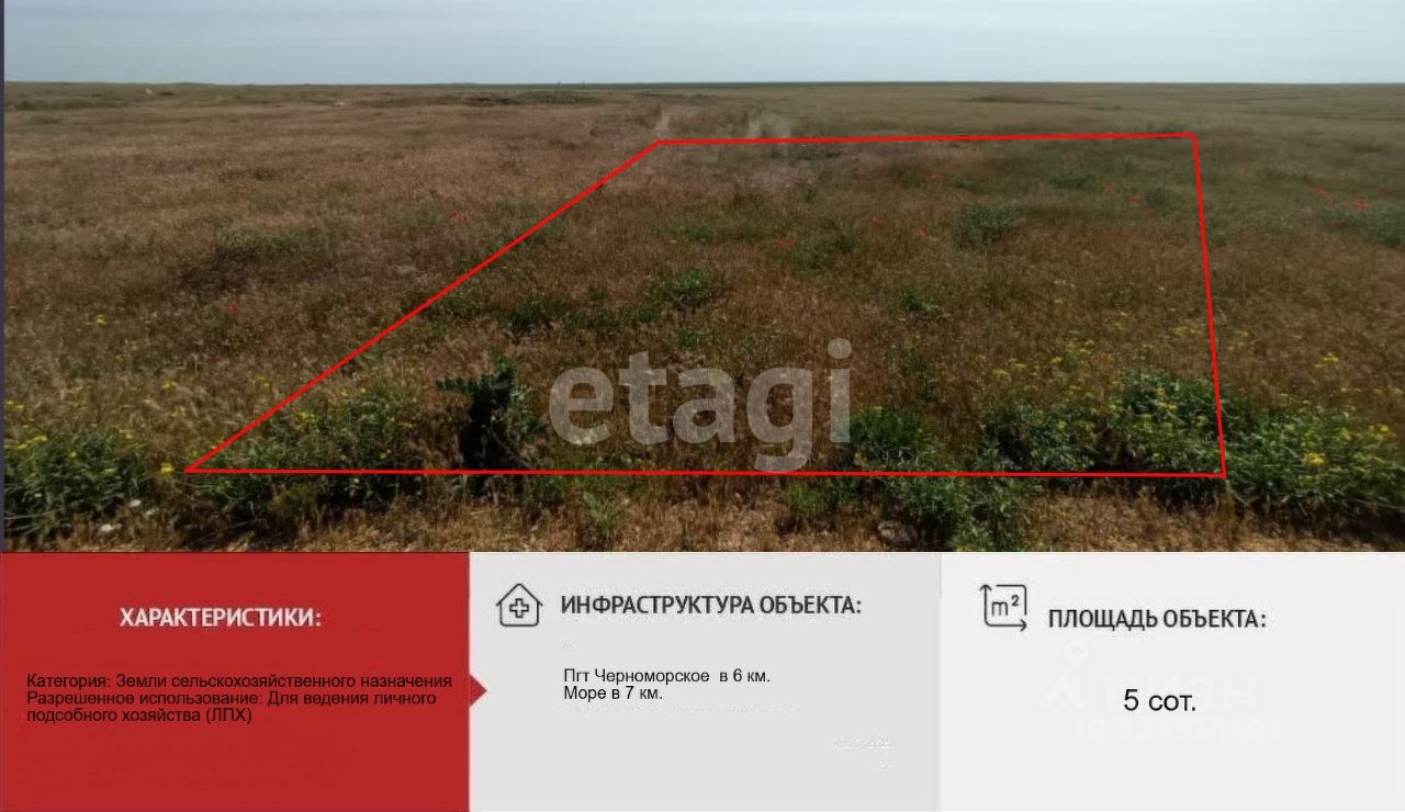 Проедется крупный земельный массив 6 га в 6 км от пгт Черноморское. Территория полностью размежевана на 84 лота от 6 соток каждый, с проложенными проездными путями и дорогами. Земли имеют категорию сельскохозяйственного назначения с разрешенным использованием для ведения личного подсобного хозяйства.