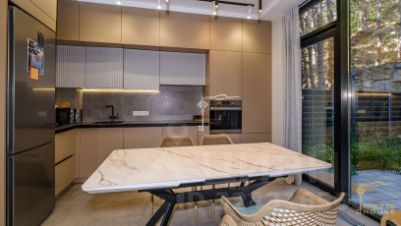 Коттедж спроектирован в стиле минимализм с элементами хай-тек - прямые архитектурные формы. Выполнен качественный ремонт в светлых тонах при использовании натуральных материалов, пол керамогранит и кварцвинил, двери выполнены из дубового шпона. Установлен кухонный гарнитур со встроенной техникой, выполнено красивое ленточное освещение, которое отлично разделяет пространства и украшает интерьер.