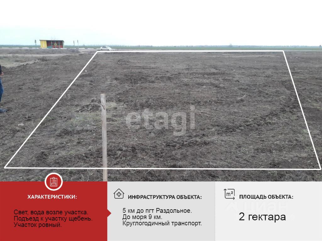 Документы РФ, готовы к сделке. Звоните, отвечу на все интересующие вопросыПродажа/аренда - приусадебный участок (ЛПХ) 2га, ровный, первая линия от трассы. До моря 9км. Ближайший райцентр 7км. Свет и вода рядом. Можно разделить/строить жилые дома.
