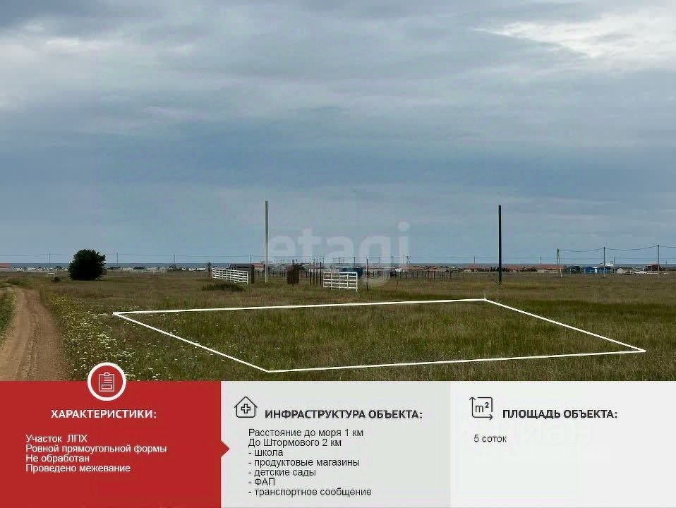 Участок правильной формы вблизи поселка Штормовое (Деревенька у моря). Категория земли: земля сельскохозяйственного назначения, для введения личного подсобного хозяйства на полевых участках.