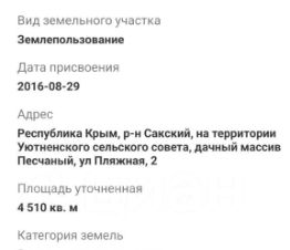 Предлагается к продаже уникальный земельный участок общей площадью 45 соток с прямым выходом на песчаный пляж Чёрного моря. Участок расположен в Сакском районе, на территории Уютненского сельского совета (дачный массив "Песчаный" по ул. Пляжная), в 10 км от центра Евпатории.