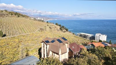 Из окон дома, террас, балконов и территории участка открываются завораживающие виды на море, горы и виноградники.