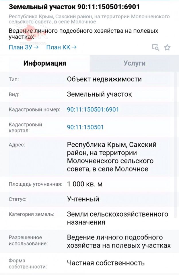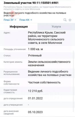 Продается участок 10 соток земли общей площадью в Крыму (Сакский район, на территории Молочненского сельского совета, в селе Молочное). Категория земель: земля сельскохозяйственного назначения, разрешенное использование: для ведения личного подсобного хозяйства на полевых участках.