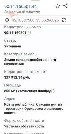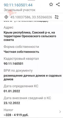 Участок расположен в очень хорошем месте. В шаговой доступности до набережной Новофёдоровка и новой Сакской набережной , соответственно моря и пляжа,менее 300 метров. Можно приобрести сразу три участка ( рядом стоящих 24 сотки) .
