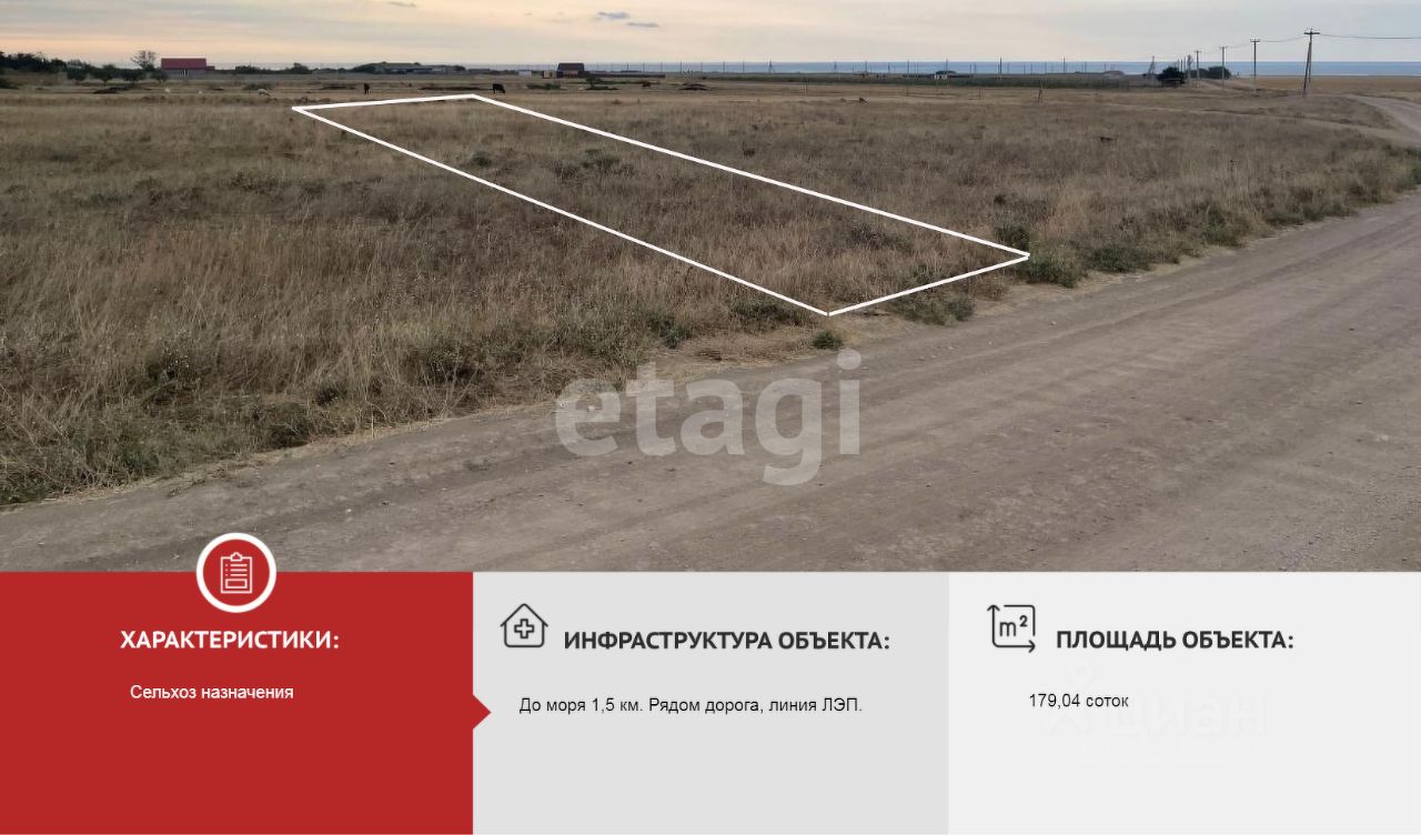 Продается видовой земельный участок у моря в селе Знаменское площадью 179,04 соток. Разрешенное использование-сельскохозяйственное использование.